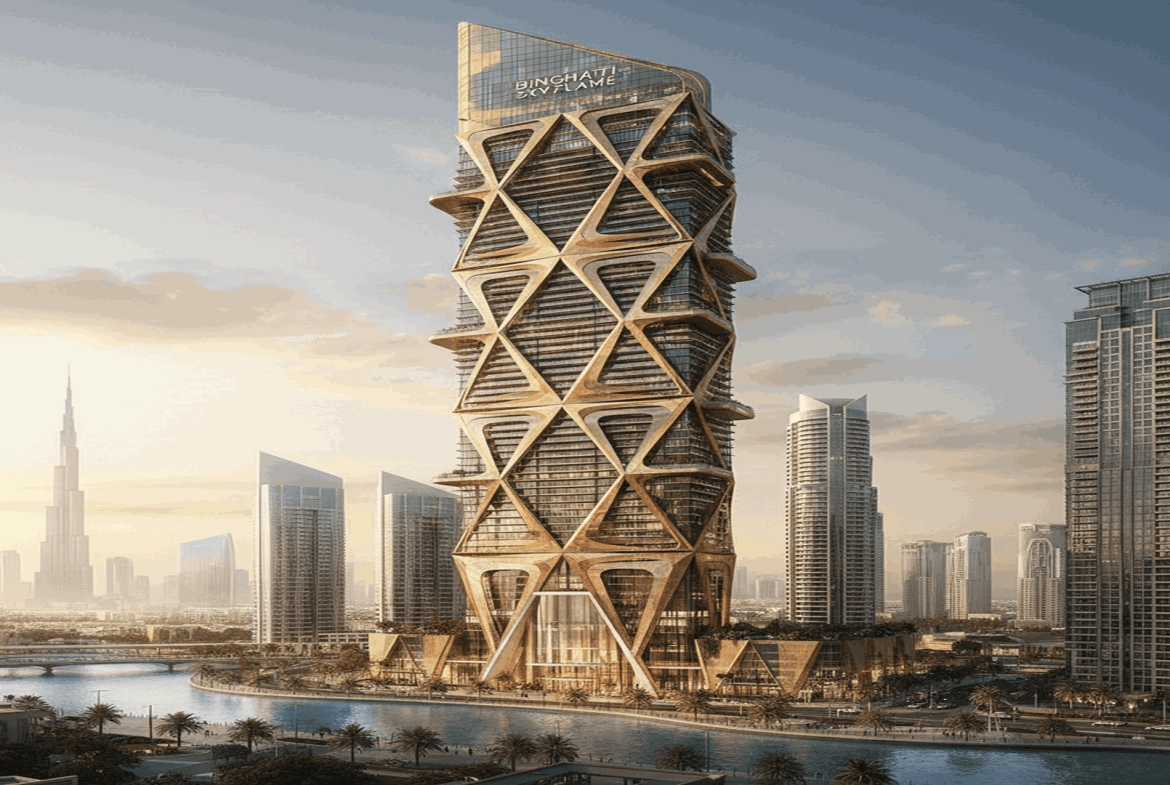 Skyflame reflects Binghatti’s recognizable approach to contemporary skyline design—bold, structured, and unmistakably modern.